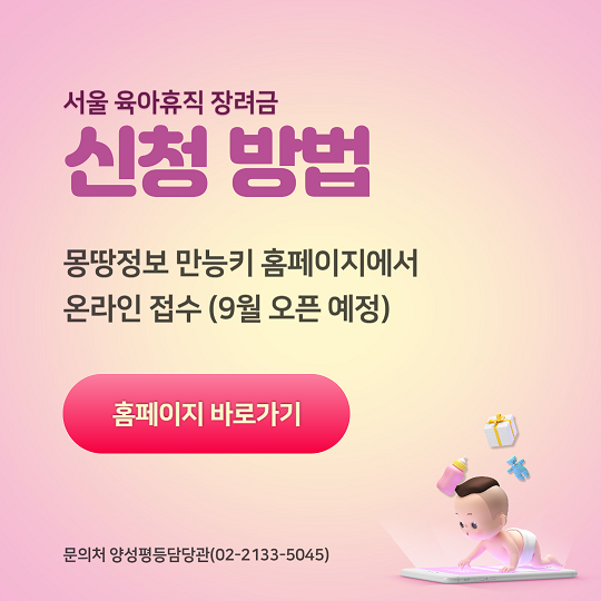 아이 키우기 좋은 서울시 만들기 프로젝트의 일환으로, 육아휴직을 사용하는 엄마아빠에게 육아휴직 장려금을 지원하여 양육자의 부담을 덜어주고자 하는 지원사업입니다. 서울시 여성가족정책부는 육아휴직을 마음 편하게 쓰지 못하는 사회 분위기를 조성하고자 육아휴직 장려금을 많은 분들이 적극 신청하길 바란다고 합니다.