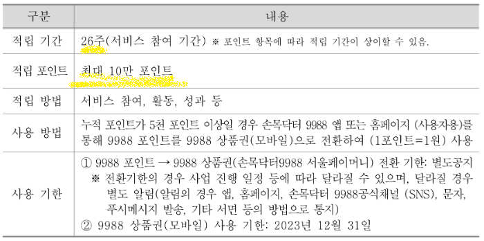 손목닥터 9988 참여자로서 저희가 가질 수 있는 큰 동기부여와 목표는 건강관리 목표달성으로 포인트를 획득하여 서울페이머니로 전환하는 것입니다. 포인트는 최대 10만원까지 모을 수 있으니, 건강관리도 하고 지원금도 챙겨보세요.