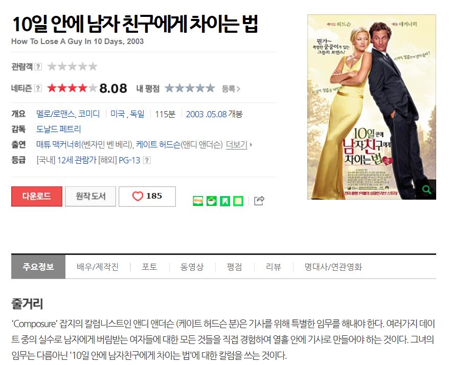 그래서 고른 영화는 , 10일 안에 남자친구에게 차이는 법. 원제는 How to lose a guy in 10 days입니다.
