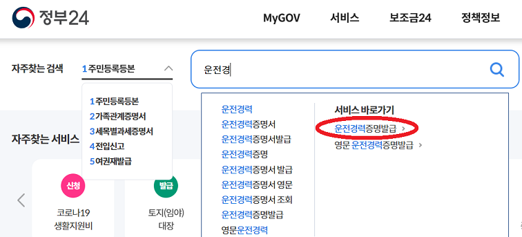 1. 정부24홈페이지에서 운전경력을 검색합니다. 서비스 바로가기에서 '운전경력증명발급'을 선택합니다. 아래 링크를 통해서 검색 없이 해당 서비스로 바로 접속할 수 있습니다.