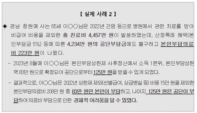 만약 동일한 요양기관에서 1년간 입원했을 때 본인이 부담해야 하는 비용이 <소득분위별 지급상한액>의 최고 금액인 598만 원을 초과할 경우에는 환자가 최고 금액(598만원)까지만 병원에 지불하면 됩니다.