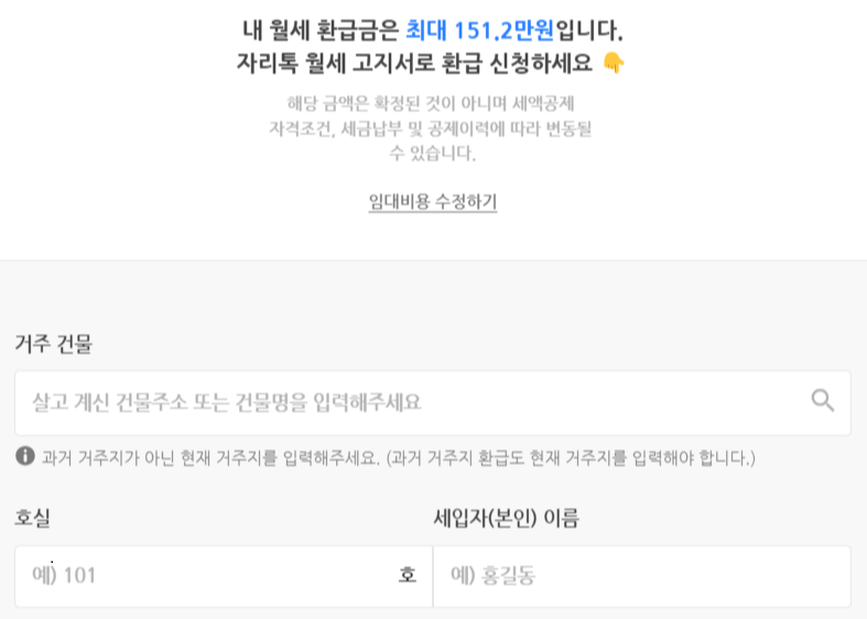 단, 국세청 홈텍스를 통한다면 집주인의 특별한 동의 없이 진행할 수 있지만, 자리톡 어플을 통해 월세환급을 신청하면 임차인이 그 집에 실제로 거주한다는 증빙을 위해 자리톡 어플에서 집주인(임대인)에게 연락을 합니다. 가입 과정에서 집주소와 집주인의 연락처를 적어야 하는 칸이 있으니 자리톡 이용 예정이라면 개인정보문제 때문에라도 가급적 집주인에게 미리 언급하는 것을 권해드려요.