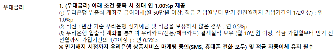 급여를 받지 않으면서 1%를 채우는 방법도 타 은행들에 비해 쉬운 편입니다. 만약 우리은행 신규가입자라면 기본 0.5% 우대를 받고 월 10만 원 이상의 카드실적(체크, 신용)을 30개월 이상 충족하면 됩니다.