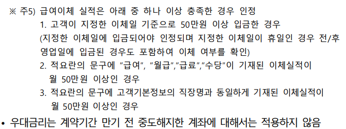 그런데 2, 3번을 잘 보면 "급여"가 쓰여 있거나, "직장명과 동일하게 기재된" 이체실적이 각각 나뉘어 있는데, 전제조건은 둘 중 하나만 충족해도 가능한 것이니 직장명과 동일한 이체실적이 아니어도 "급여"가 명시되어 있다면 조건이 충족 가능하네요.