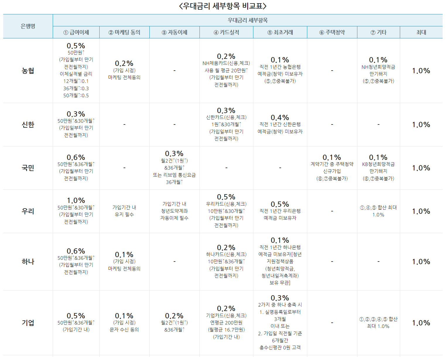 아래 표만 봐도 우대금리 세부항목이 총 7개나 됩니다. 합산해서 1%가 넘는다고 해도 최대 1%만 인정되니 주의하세요. 일단 본인의 주거래은행을 한번 잘 살펴보시기 바랍니다.