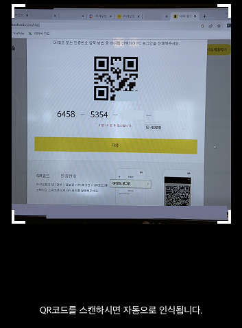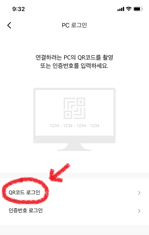 4. QR 코드로그인을 누른 후, PC 화면의 QR 코드를 스캔해 주세요. 만약 스캔이 안된다면 인증번호 로그인을 누른 후 컴퓨터 화면에 떠 있는 숫자를 스마트폰에 직접 입력하면 됩니다.