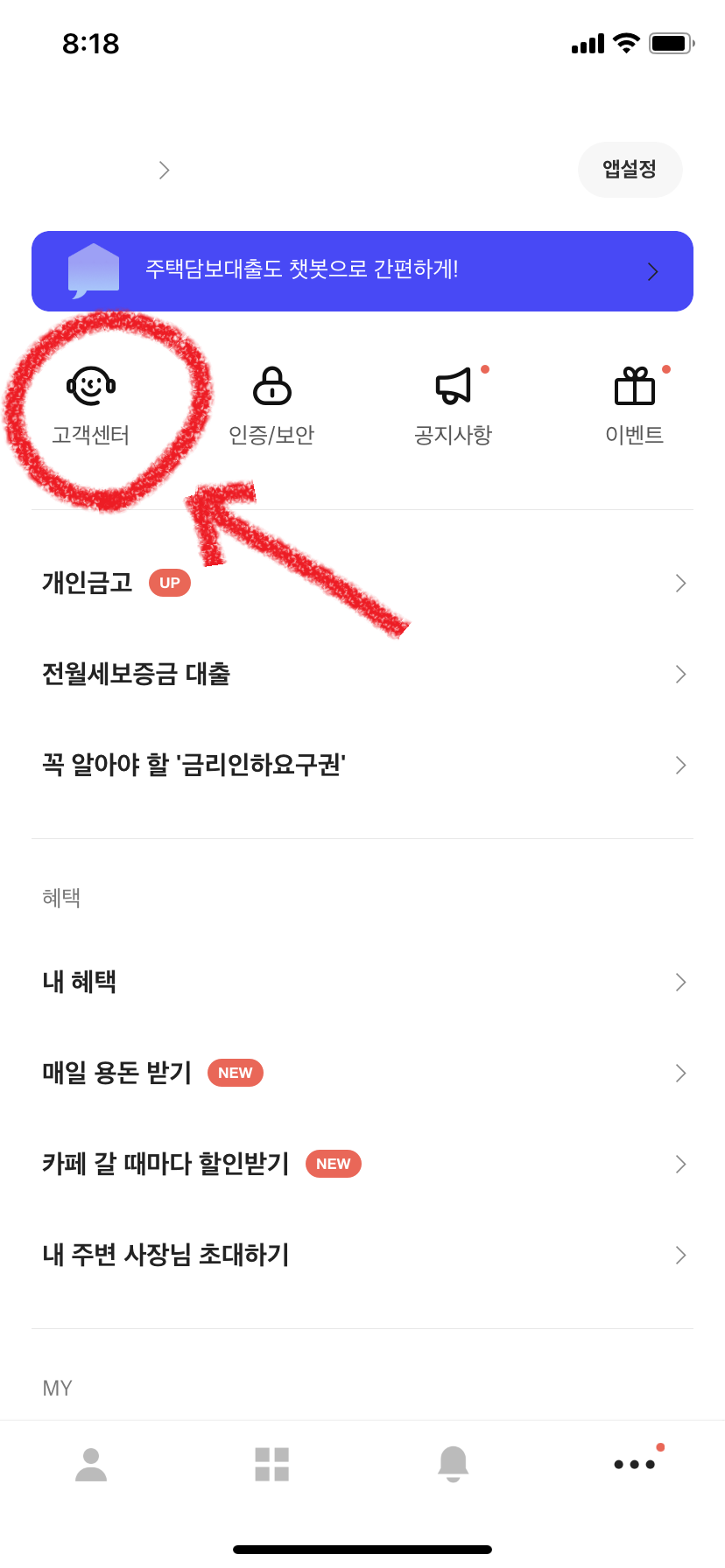 2. 왼쪽 상단의 고객센터로 들어갑니다.