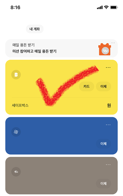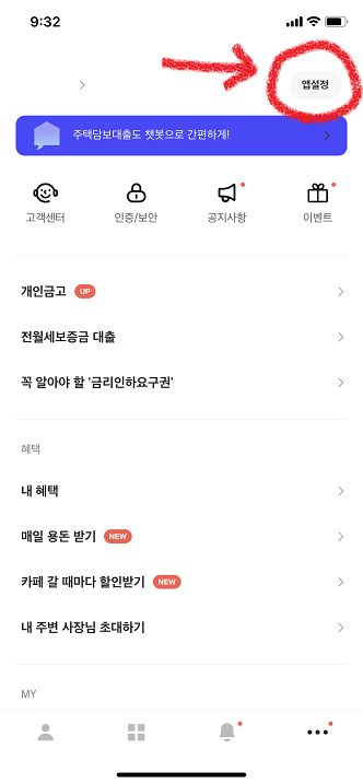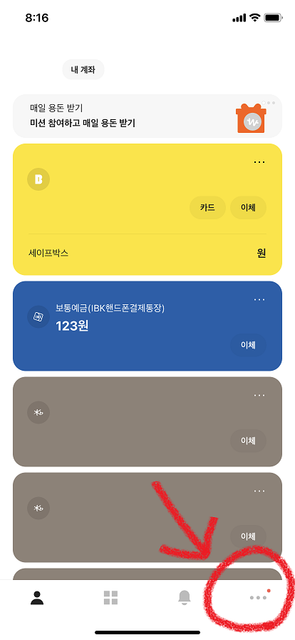 1. 카카오뱅크를 로그인한 후 오른쪽 하단의 ··· 점 세 개 아이콘을 눌러주세요.
