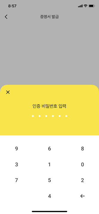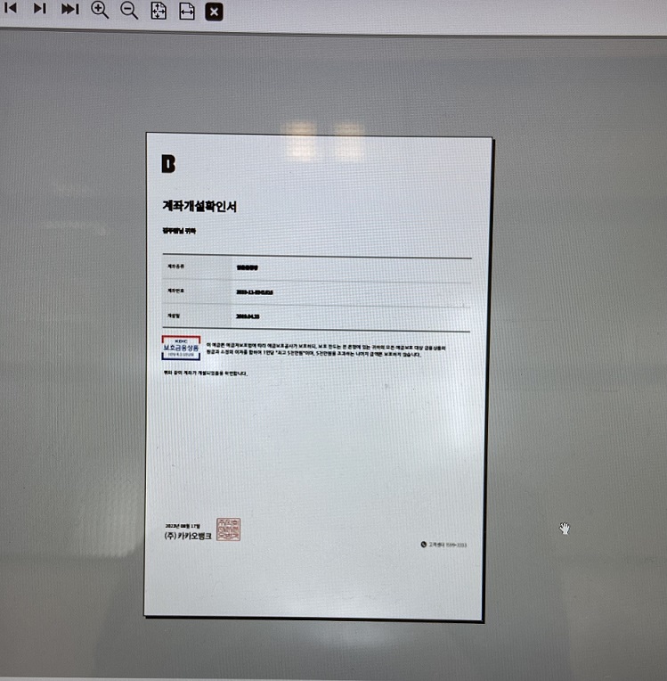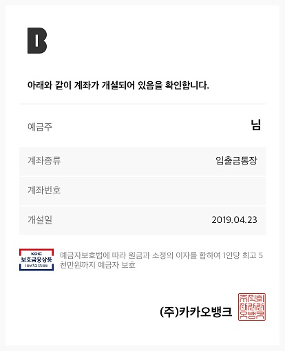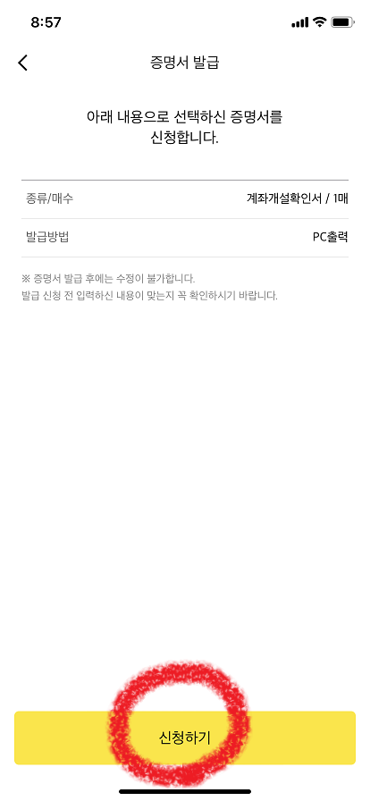 8. 신청하기를 누른 후 인증 비밀번호를 입력하면 신청이 완료됩니다. 신청한 통장사본, 계좌개설확인서는 카카오톡 홈페이지에서 출력할 수 있습니다.