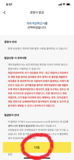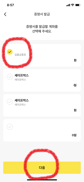 7. 발급을 원하는 계좌를 선택한 후 다음을 눌러주세요.