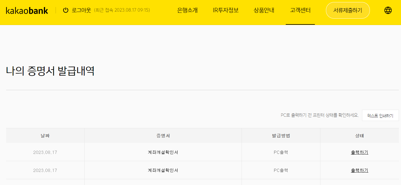 위의 방법으로 발급받은 통장사본도 충분하지만, 카카오뱅크 통장사본 제출용이나 PC 출력이 필요하신 분들을 위해 출력방법을 자세히 알려드릴게요. 카카오뱅크 어플로 먼저 신청을 한 후에 카카오뱅크 홈페이지에서 출력할 수 있습니다.