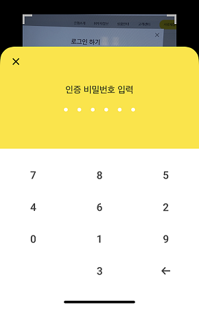 2. 로그인을 합니다. 로그인을 위해 아래와 같은 창이 뜨는데, 당황하지 마시고 카카오뱅크 어플을 다시 켜주세요. 오른쪽 하단의 ··· 점 세 개 버튼을 눌러주세요.