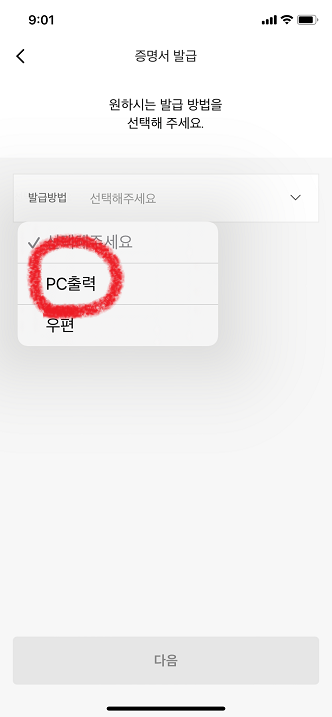 6. PC 출력과 우편 중 원하시는 발급방법을 선택하세요. 우편 선택 시에는 약 5~7일 정도 소요됩니다.