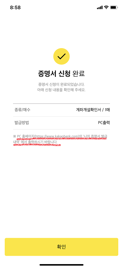 8. 신청하기를 누른 후 인증 비밀번호를 입력하면 신청이 완료됩니다. 신청한 통장사본, 계좌개설확인서는 카카오톡 홈페이지에서 출력할 수 있습니다.