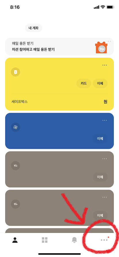 1. 카카오뱅크를 로그인한 후 오른쪽 하단의 ··· 점 세 개 아이콘을 눌러주세요.