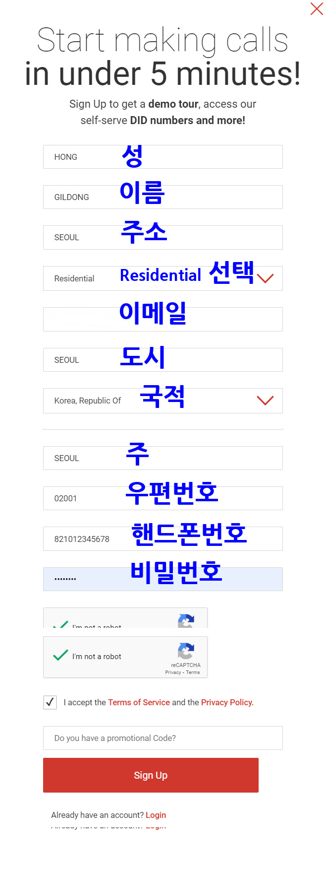 2. 회원가입 입력란에 다음과 같이 입력해주세요.