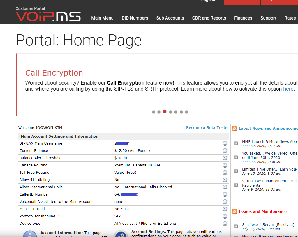 저는 현재 로컬번호를 구입했기 때문에 계정 번호와 핸드폰 번호, 그리고 계좌 금액까지 표시가 되네요.